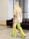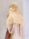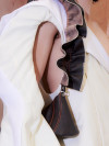 By alienating traditional pattern making, which tries to bring the body into perfect symmetry, an aesthetic appears that is not primarily composed of regularity and harmony. Alienation also takes place in the processing of the materials; for example, the structure of knit is transferred to the leather by embossing. For the ruffled dress I developed a system of smocked fabric ribbons that can be connected with metal rings.